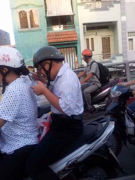 | Tranh thủ nạp năng lượng trên đường đi. |