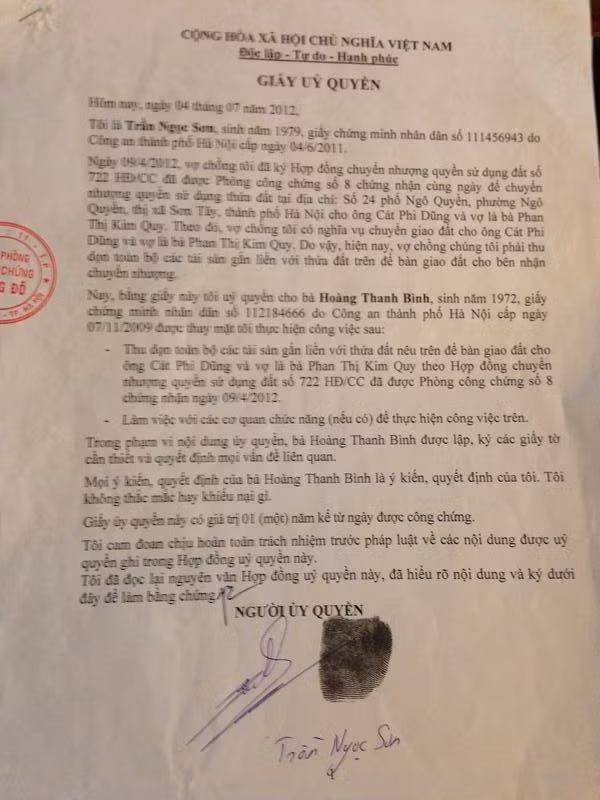 Giấy ủy quyền này được văn phòng công chứng Đông Đô chứng nhận. Trong thời gian ủy quyền đó để đợi anh Dũng thu xếp tiền trả nốt cho anh Sơn, nhưng anh Dũng không trả.