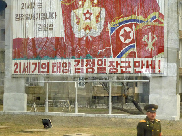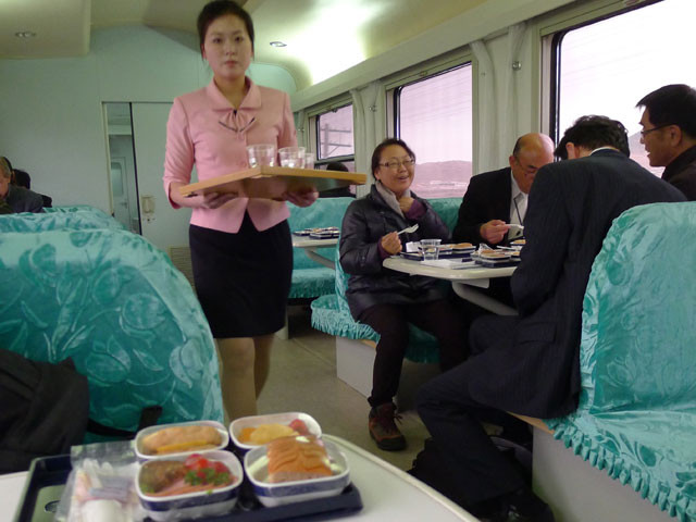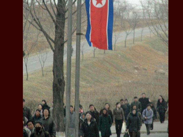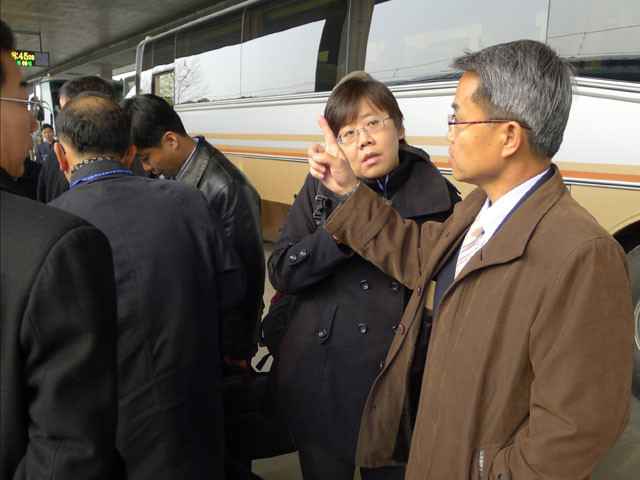 | Quan chức Triều Tiên đứng ở bến ga để đảm bảo sự an toàn cho các phóng viên lên tàu trong chuyến đi đến bãi thử Tongchang-ri. |