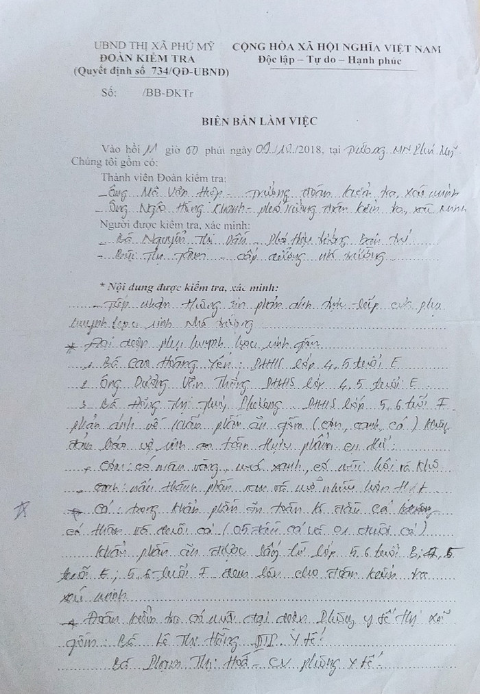 Chúng ta cùng tìm hiểu biên bản được lập ngày 9/10 giữa phụ huynh, nhà trường và đoàn thanh tra của thị xã Phú Mỹ ghi rõ: