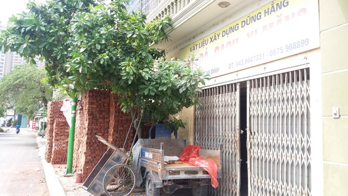 | Cửa kinh doanh hàng vật liệu xây dựng Dũng Hằng ngang nhiên lẫn chiếm vỉa hè của người đi bộ. Ảnh Trần Việt. |