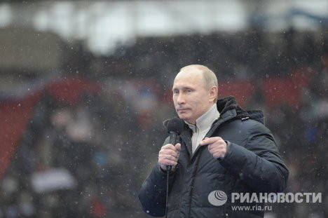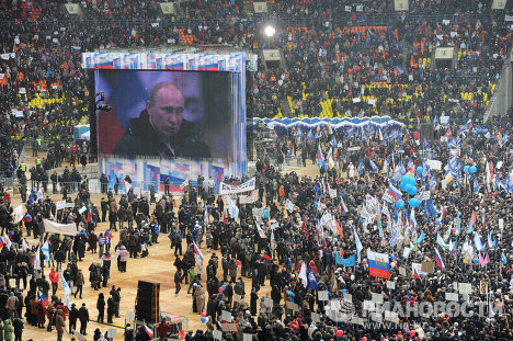 Trong cuộc biểu tình khổng lồ của 130.000 người ngày 23/2 ở sân vận động Luzhniki tại Moscow, Thủ tướng Putin đã xuất hiện với những lời khích lệ quần chúng.
