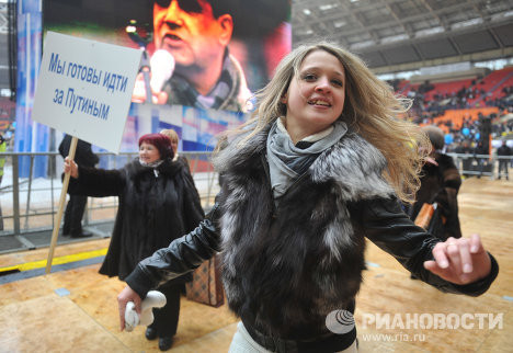 Sân vận động chật kín người với hàng loạt tấm biểu ngữ:“Ai, nếu không phải là Putin?”, “hãy bỏ phiếu cho sự ổn định – bỏ phiếu cho Putin”.
