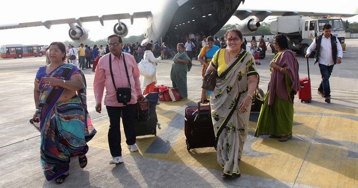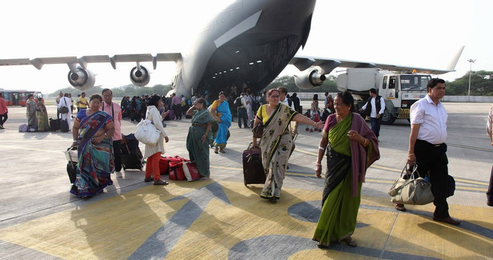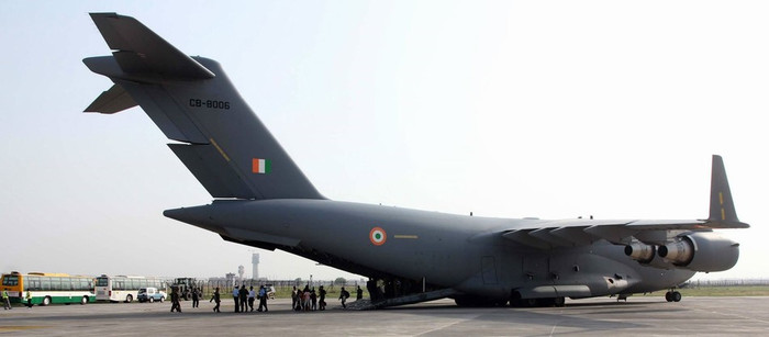 | Ngày 26 tháng 4 năm 2015, máy bay vận tải chiến lược C-17 Không quân Ấn Độ vật chuyển các nạn nhân động đất về New Delhi |