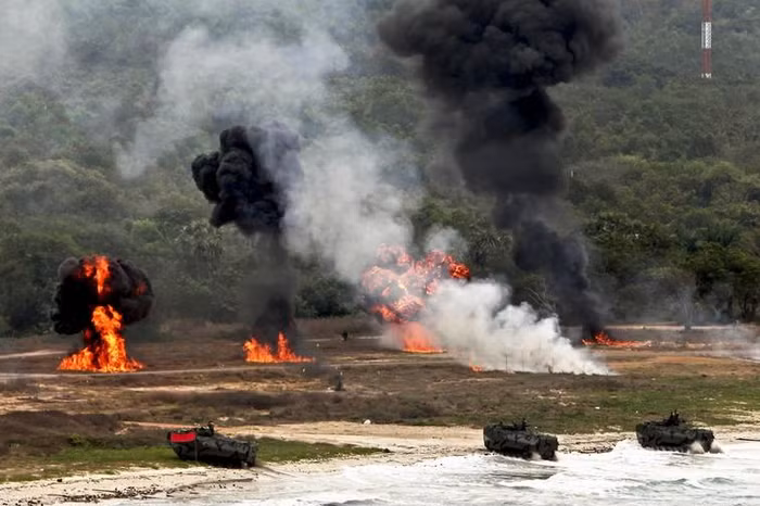 | Binh sĩ Hàn Quốc và xe chiến đấu đổ bộ Thái Lan tiến hành diễn tập tác chiến đổ bộ |