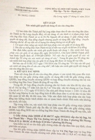 Tại Kết luận số 386/KL ngày 27/1/2014 của Chủ tịch UBND TP.Hạ Long đã chỉ rõ hàng loạt sai phạm của cán bộ, lãnh đạo một số phường và UBND TP.Hạ Long dẫn đến việc "cấp khống", cấp sai 8 GCNQSDĐ gây hậu quả nghiêm trọng và không thể khắc phục được.