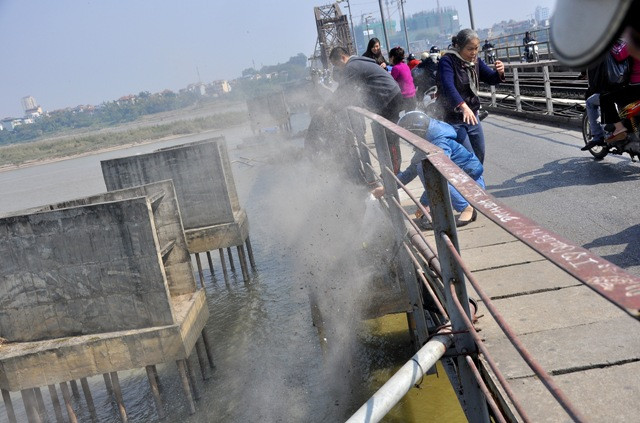 | Khu vực trên cầu Long Biên là điểm tập trung nhiều người thả cá, bát hương, tro, bàn thờ… xuống sông Hồng trong ngày ông Công, ông Táo. |
