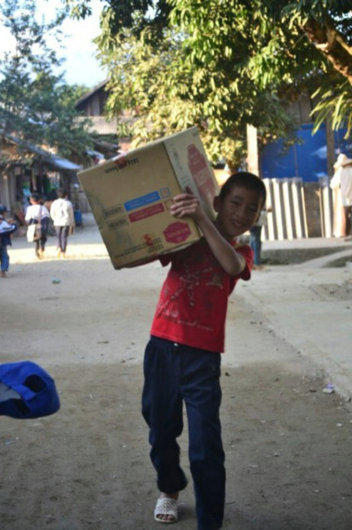 | Những đứa trẻ xã Mường Mô hào hứng vác những thùng quà bánh kẹo Tết cùng đoàn từ thiện. |