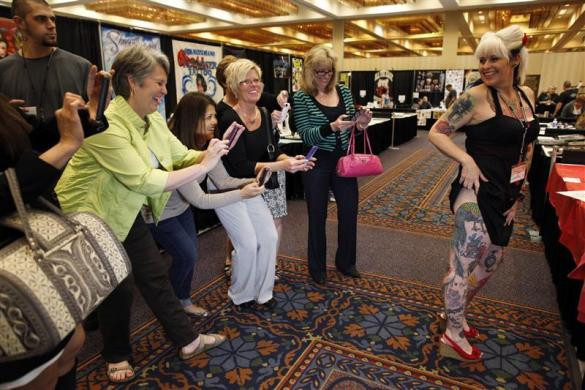| Keisha Holcomb, 31 tuổi, đến từ Fort Collins, Colorado đang khoe những hình xăm ở chân. Holcomb khi mới 16 tuổi đã bắt đầu xăm hình và bây giờ cô mới trở thành một nghệ sĩ xăm hình. Cô muốn xăm hình toàn thân nhưng ngoại trừ cổ họng, bàn tay và đầu. |