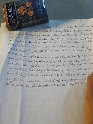 Ám ảnh đầu tiên có lẽ là những dòng chữ liêu xiêu, vẹo vọ, lỗi chính tả be bét, nguệch ngoạc trên tờ giấy trắng. Do có quá nhiều tình tiết ghê sợ, phóng viên không thể chuyển tải chi tiết tới độc giả. Chỉ một phần nào đó, chúng tôi cố gắng lọc ra và đăng tải.