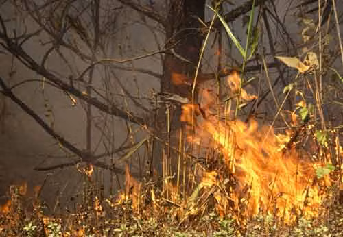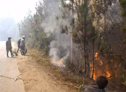 | Vụ cháy bùng phát mạnh, kiểm lâm và người dân bất lực do phương tiện chữa cháy thô sơ. |