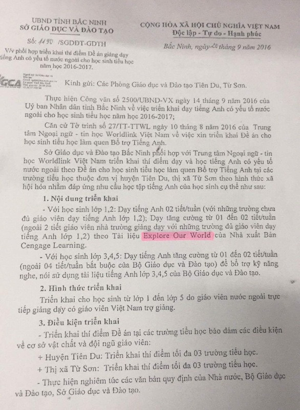 | Công văn của Sở Giáo dục và Đào tạo tỉnh Bắc Ninh cho phép sử dụng giáo trình tiếng Anh Explore Our World của Nhà xuất bản Cengage Learning vào việc giảng dạy học sinh lớp 1, 2 khi chưa được Bộ ban hành hoặc thẩm định. Ảnh Bạn đọc cung cấp. |