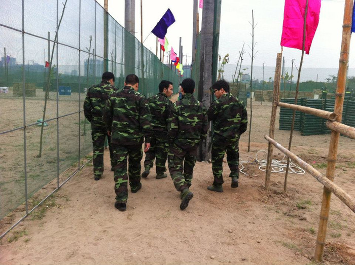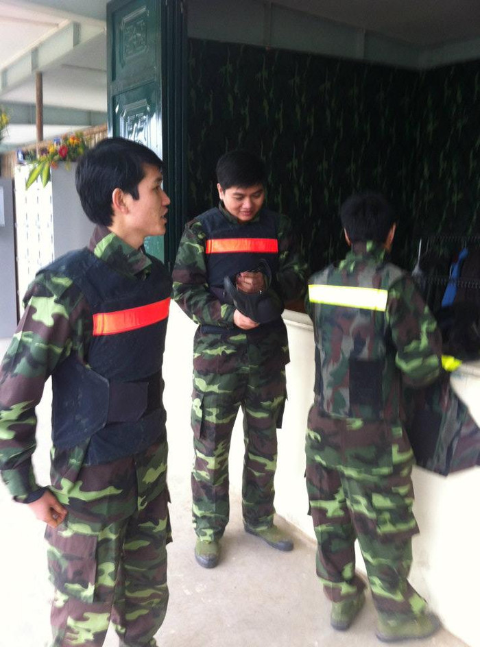 | Một "chiến sĩ" phía trên đang chiến đấu, đồng đội phía sau ra hiệu lệnh hết đạn, cần tiếp tế. |