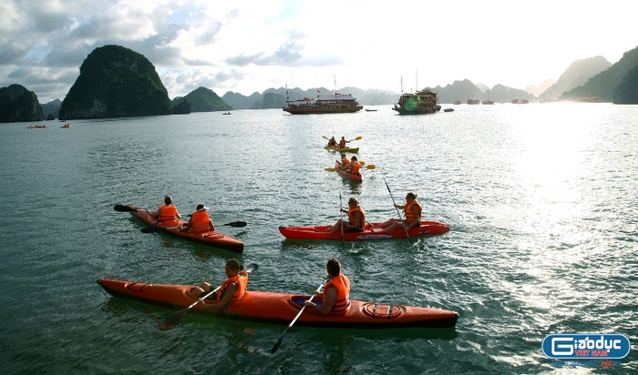 | Du khách rất thích thú khi được tự tay chèo thuyền ngắm Vịnh Hạ Long. |