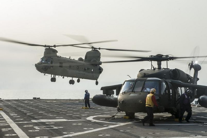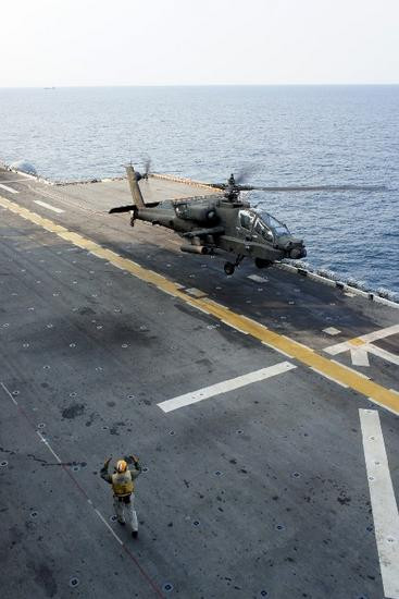 | Ngày 11 tháng 4 năm 2014, tàu tấn công đổ bộ USS Bonhomme Richard LHD-6 của Hải quân Mỹ tiến hành huấn luyện ở biển Hoa Đông, máy bay trực thăng AH-64D Apache hạ cánh trên tàu (nguồn Tân Hoa xã). |