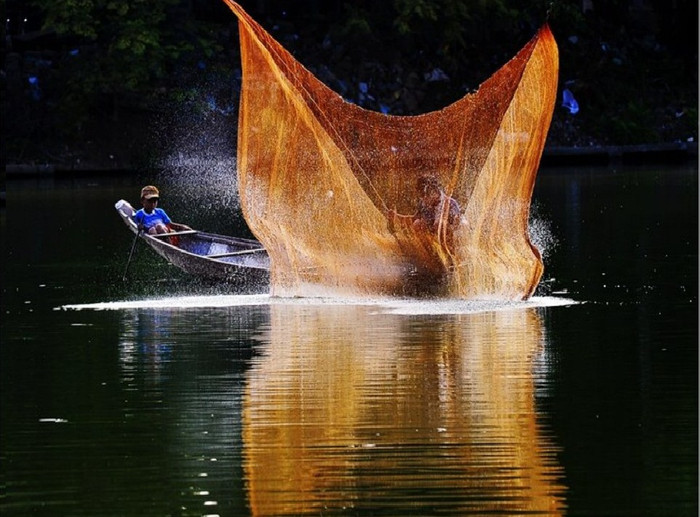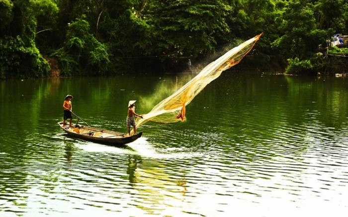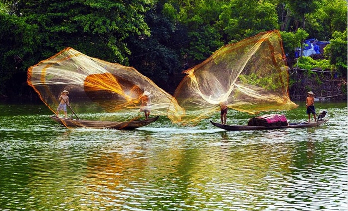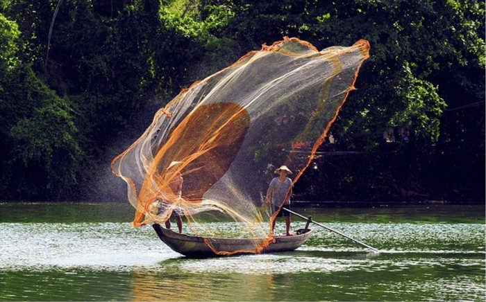 | Bắt đầu một Bình minh, người dân làng chài lại lên thuyền tung lưới mong một ngày thuận lợi nhiều may mắn, cuộc sống hàng ngày của họ cũng yên bình như dòng sông Như Ý vậy |