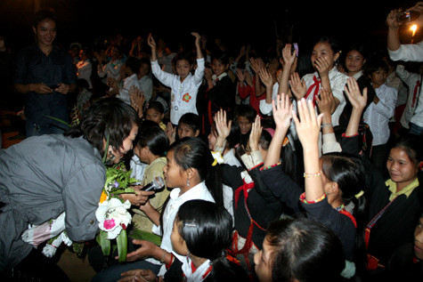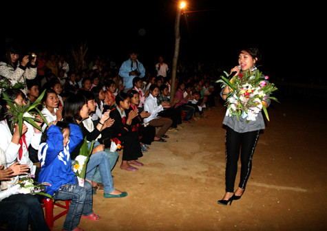 | Biết khuấy động sân khấu, Thái Thùy Linh khiến cho các em học sinh nghèo có một đêm giao lưu đáng nhớ. |