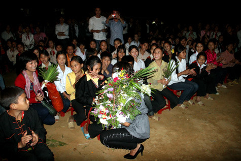 | Thay bằng cat - sê, Thái Thùy Linh nhận được rất nhiều hoa rừng và tình cảm của các em học sinh Nậm Mười. |