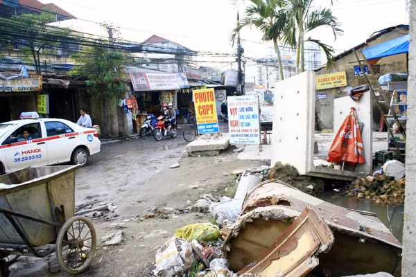 | Những ngày này ở Hà Nội không mưa nhưng con đường này lúc nào cũng bì bõm nước bẩn ứ đọng |