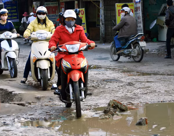 | Người dân đi lại rất khó khăn vì các ổ trâu, ổ "khủng long" |