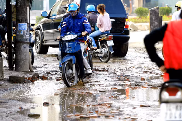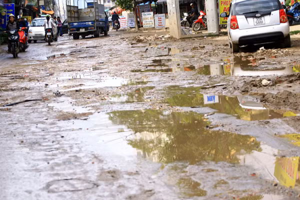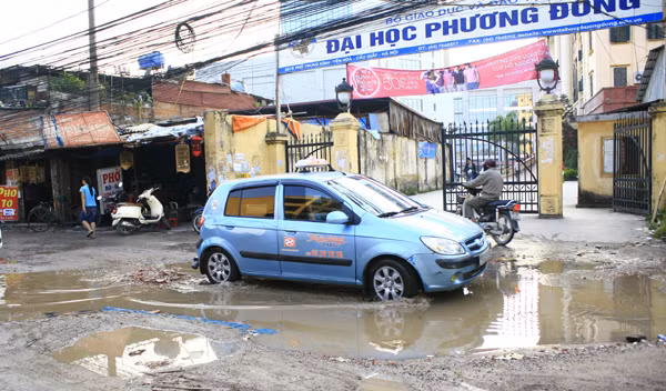 | Đặc biệt, tại đoạn trước cổng trường Đại học Phương Đông, vật liệu xây dựng, cột điện, quán cóc vỉa hè xâm lấn lòng đường nên mặt đường hẹp càng hẹp hơn và ngổn ngang ổ trâu, ổ gà, thường xuyên ngập nước. |