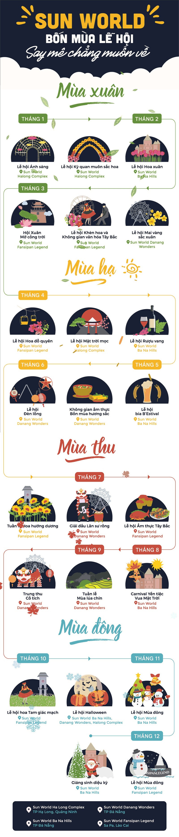Khỏi cần nghĩ ngợi mông lung mỗi đợt nghỉ lễ, nghỉ hè…cứ nắm lịch lễ hội này ở các Sun World là có thể lên kế hoạch ăn chơi cho cả nhà suốt năm rồi.