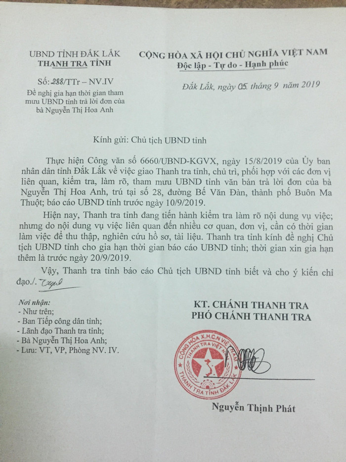 Thế nhưng, ngày 5/9/2019 (đúng vào ngày lễ khai giảng), Thanh tra tỉnh Đắk Lắk đã có Công văn số 188/TTr-NV.IV do Phó Chánh thanh tra Nguyễn Thịnh Phát ký đề nghị gia hạn thời gian tham mưu Ủy ban Nhân dân tỉnh trả lời đơn của bà Nguyễn Thị Hoa Anh.