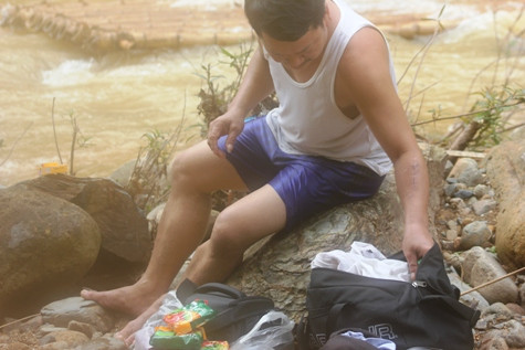 Qua được suối Ngàm, thì quần áo trên người cũng ướt sũng. Ảnh: Xuân Quang.