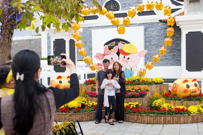 Kết hợp khéo léo giữa truyền thống với hiện đại, không gian Tết tại công viên độc đáo nhất miền Trung với chủ đề “Heo vàng gõ cửa” khiến bất cứ người dân, du khách đặt chân đến cũng tròn mắt ngạc nhiên với những tiểu cảnh ngộ nghĩnh, sinh động và bắt mắt.