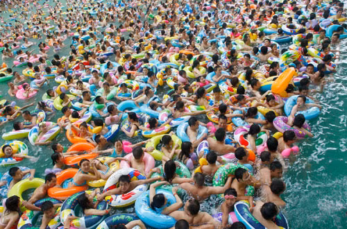 Hình ảnh thường gặp tại các bể bơi ở Trung Quốc trong những dịp cao điểm nắng nóng của mùa hè. Năm 2010, ước tính dân số Trung Quốc ở mốc 1,3 tỉ người, chiếm 1/5 tổng dân số của toàn thế giới.