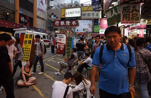 Ảnh chụp quang cảnh một con phố thuộc quận Mong Kok (Hồng Kông, Trung Quốc) tháng 10.2011. Mong Kok được ghi nhận là khu vực có mật độ dân số cao nhất thế giới với 130.000 người/km2