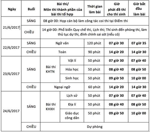 - Từ ngày 22/6 đến 24/6: Thí sinh làm bài thi kỳ thi quốc gia 2017 theo lịch thi dưới đây: