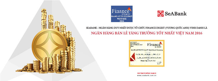 Sự phát triển mạnh mẽ dịch vụ ngân hàng bán lẻ của Ngân hàng TMCP Đông Nam Á (SeABank) đã được vinh danh “Ngân hàng bán lẻ tăng trưởng tốt nhất Việt Nam 2016” (Excellence In Growth For Retail Banking Vietnam 2016) được tổ chức quốc tế Finance Digest (Vương quốc Anh) bình chọn và trao tặng.