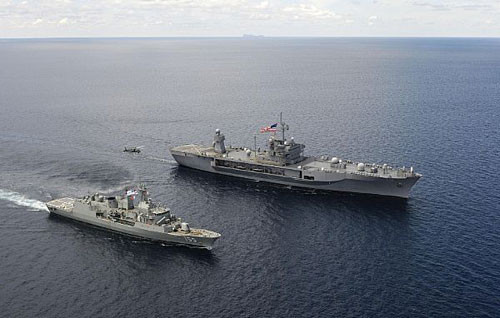 | Tàu chỉ huy đổ bộ USS Blue Ridge LCC-19 của Hạm đội 7 Mỹ và tàu hộ vệ Hải quân Australia tiến hành diễn tập liên hợp trên biển Đông. |
