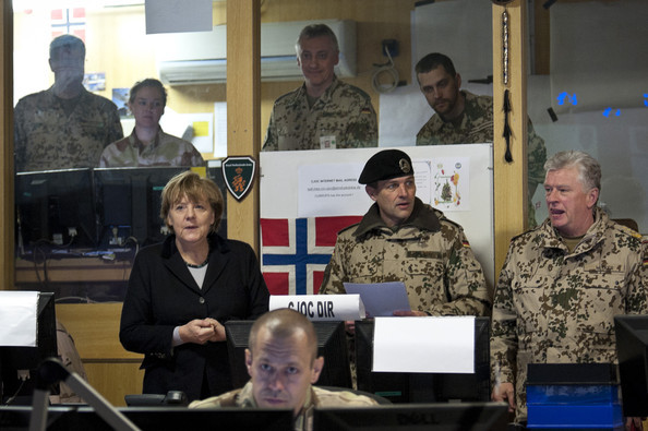 | Thủ tướng Angela Merkel và Chỉ huy quân đội Liên bang Đức Bundeswehr - Erich Pfeffer thăm đài tưởng niệm các liệt sĩ tại căn cứ quân sự Đức. |