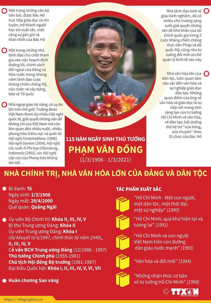 94 tuổi đời, 75 năm hoạt động cách mạng, 41 năm là Ủy viên Trung ương Đảng, 35 năm là Ủy viên Bộ Chính trị, 32 năm là Thủ tướng Chính phủ, 10 năm là Cố vấn Ban Chấp hành Trung ương, đồng chí Phạm Văn Đồng là nhà lãnh đạo có uy tín lớn của Đảng, Nhà nước; nhà văn hóa lớn của dân tộc, con người rất mực trung thành, suốt đời chiến đấu vì độc lập dân tộc, vì hạnh phúc của nhân dân.