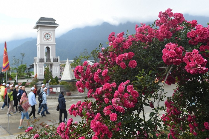 Vườn hồng leo và hồng cổ đẹp lung linh bên khu vực tháp đồng hồ nơi chân núi.