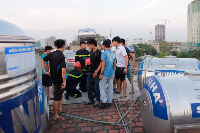 Cùng lúc này, lực lượng PCCC quận Cầu Giấy và hai nữ bác sĩ tới hiện trường để trợ giúp đưa cô gái xuống phía dưới.
