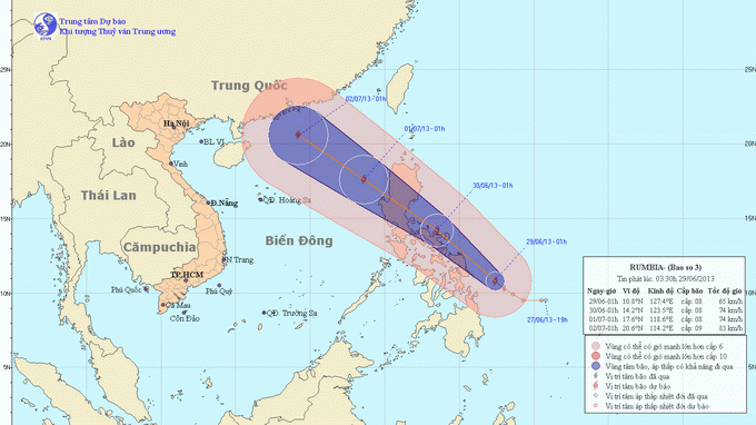 Dự báo trong 24 giờ tới, bão di chuyển chủ yếu theo hướng giữa Tây Tây Bắc và Tây Bắc, mỗi giờ đi được khoảng 20 - 25km và còn có khả năng mạnh thêm. Như vậy khoảng sáng mai (30/6) bão sẽ đi vào khu vực phía Đông biển Đông. Đến 19 giờ ngày 30/06, vị trí tâm bão ở vào khoảng 16,8 độ Vĩ Bắc; 118,3 độ Kinh Đông, cách quần đảo Hoàng Sa khoảng 630km về phía Đông. Sức gió mạnh nhất vùng gần tâm bão mạnh cấp 8, cấp 9 (tức là từ 62 đến 88 km một giờ), giật cấp 10, cấp 11.