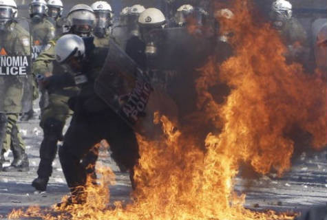 7. Cảnh sát chống bạo động Hy Lạp phải dùng hơi cay và biện pháp trấn áp mạnh khác với người biểu tình quá khích, trong cuộc tổng đình công kéo dài hai ngày đang làm tê liệt các hoạt động tại nước này. Một số người biểu tình đã ném bom xăng và gạch đá về phía cảnh sát trong một phản ứng của người dân trước các kế hoạch đang được thảo luận trong quốc hội Hy Lạp về việc cắt giảm hàng nghìn việc làm và tăng thuế. (AP)
