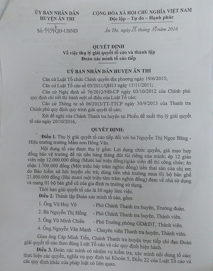 Sự việc xảy ra từ cuối tháng 12/2015, một người tên là Đỗ Văn Phượng (thôn Trà Phương, xã Hồng Vân) gửi tới Thanh tra huyện Ân Thi (tỉnh Hưng Yên) đơn tố cao cô giáo Nguyễn Thị Ngọc Băng - Hiệu trưởng Trường Mầm non xã Hồng Vân (huyện Ân Thi) 4 nội dụng:
