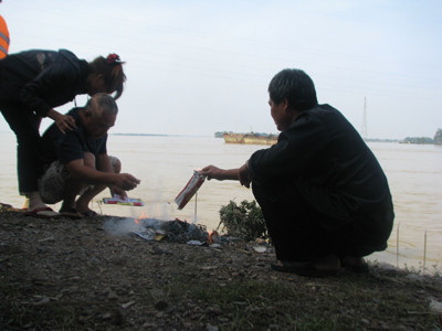 | 8h 40 phút, thi thể nạn nhân thứ hai vừa tìm được đã được đưa về nơi tập kết tại cầu Rong và được lực lượng chức năng tiến hành khâm liệm. |