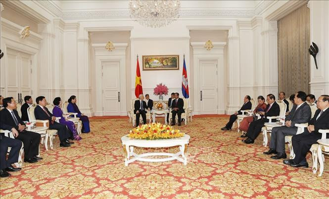 Tiếp tục chương trình thăm cấp nhà nước Vương quốc Campuchia, sáng 26/2/2019, tại Cung Hòa Bình ở Thủ đô Phnom Penh, Tổng Bí thư, Chủ tịch nước Nguyễn Phú Trọng hội kiến với Thủ tướng Chính phủ Hoàng gia Campuchia Samdech Hun Sen.