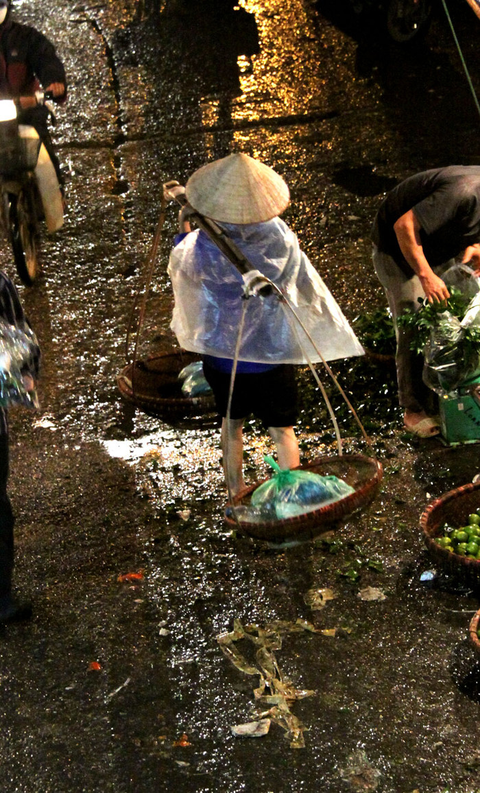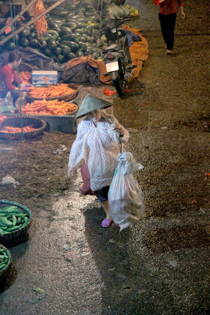 | Và những "cửu vạn" lại nặng trĩu trên vai "gánh mưu sinh" trong màn đêm mưa rét. |
