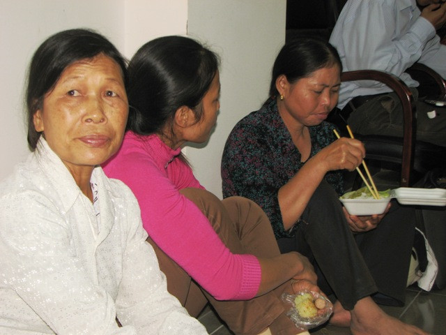 Do người thân gia đình chị Thơm ở xa, mà phần đông là người cao tuổi nên mọi người đã phải tá túc buổi trưa tại bệnh viện. Bữa ăn trưa tạm bợ, nghẹn đắng chờ được làm việc vào buổi chiều cùng ngày.