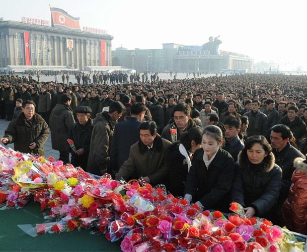 | Người dân dâng hoa tại hai bức tượng Chủ tịch Kim Jong-il và thân phụ Kim II-sung mới được khánh thành |