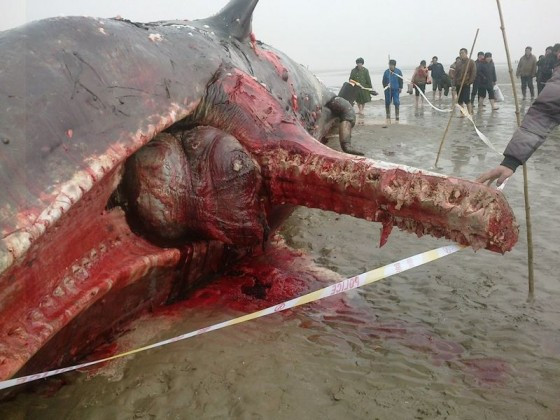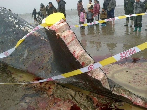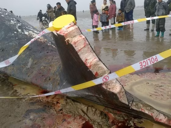 | Máu cá voi bị xẻo thịt chảy thẫm bờ biển |