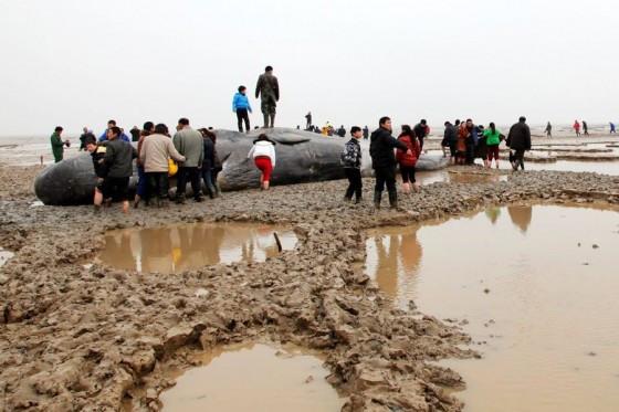 | Con cá voi bị mắc cạn vùng vẫy trong vùng n ước nông. |