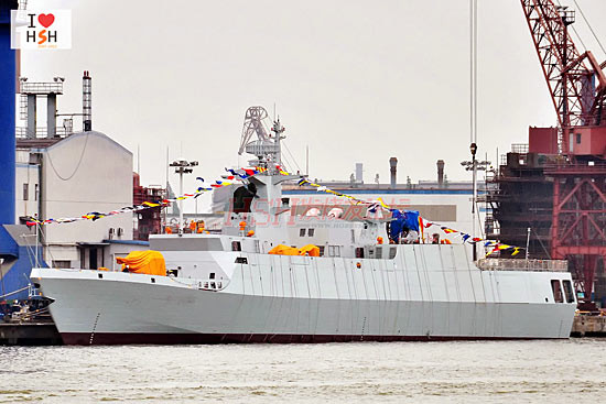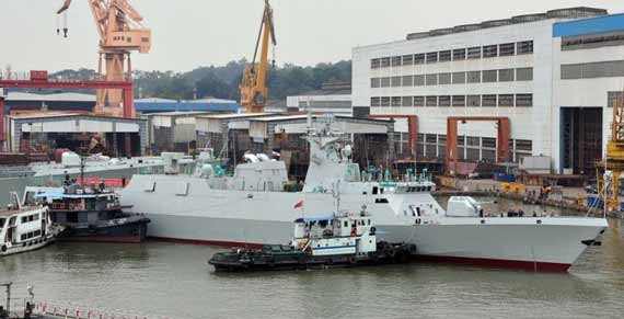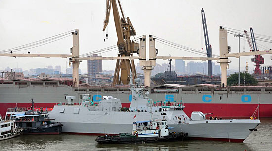 Chiếc tàu hộ vệ 056 đầu tiên hạ thủy tại nhà máy đóng tàu Trung Hoa, Hỗ Đông, Thượng Hải, Trung Quốc vào ngày 23/5.