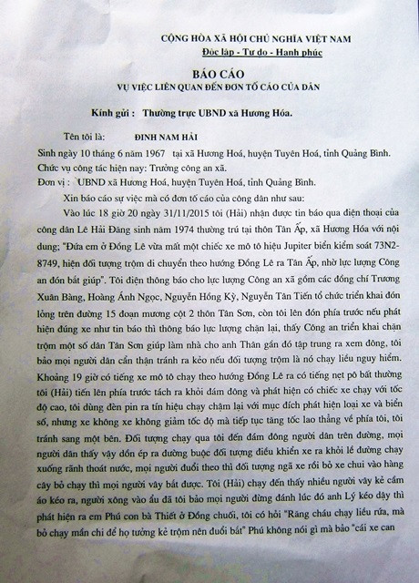 | Đơn tường trình của ông Đinh Nam Hải, Trưởng Công an xã Hương Hóa có nhiều mâu thuẫn với đơn của em Nguyễn Đức Phú (Ảnh: Thủy Phan) |